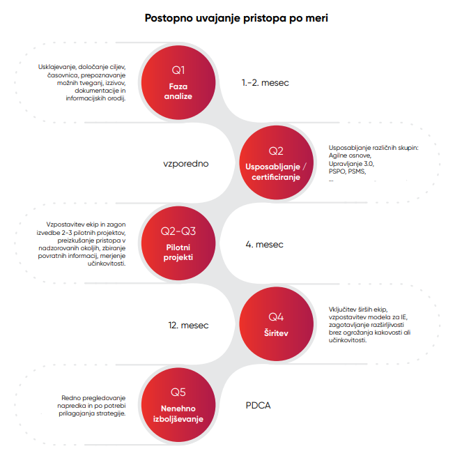 V Iskraemecu agilni pristop ni novost, vendar je omejen na upoštevanje agilnih ritualov predvsem v skupini za razvoj programske opreme. Širše sprejetje agilnega pristopa v Iskraemecu vključuje postopen pristop. Začeli smo s fazo analize, da bi uskladili cilje, določili časovne okvire in opredelili morebitna tveganja ter ocenili pripravljenost za uvedbo agilnih pristopov. Sledijo pilotni projekti za preizkušanje agilnega modela in pristopa v nadzorovanih okoljih, nenehno izboljševanje z rednimi pregledi napredka ter usposabljanje in certificiranje naših zaposlenih, da se ekipe