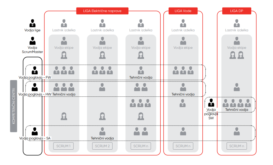 Na ta način skrbi za redno dobavo pomenljivih izdelkov kupcu. »Scrum master« je odgovoren za izvajanje učinkovitih agilnih ritualov, spodbuja sodelovanje v ekipi in poskrbi, da je napredek viden deležnikom. Tehnični vodja zastopa razvojno ekipo in skrbi za tehnični vidik projekta. Tesno sodeluje s »Prodcut Owner-jem« in »Scrum Master-jem« ter drugimi deležniki, da bi tehnične rešitve uskladil s poslovnimi cilji. V ekipi bomo imeli več tehničnih strokovnjakov – razvojnikov, vendar bo eden imenovan za zastopanje tehničnega vidika. Po Iskraemeco modelu je več ekip združenih v ligo. Trenutno vidimo, da imamo ligo za elektriko, digitalne platforme in vodo, kar sovpada z našimi poslovnimi enotami.
